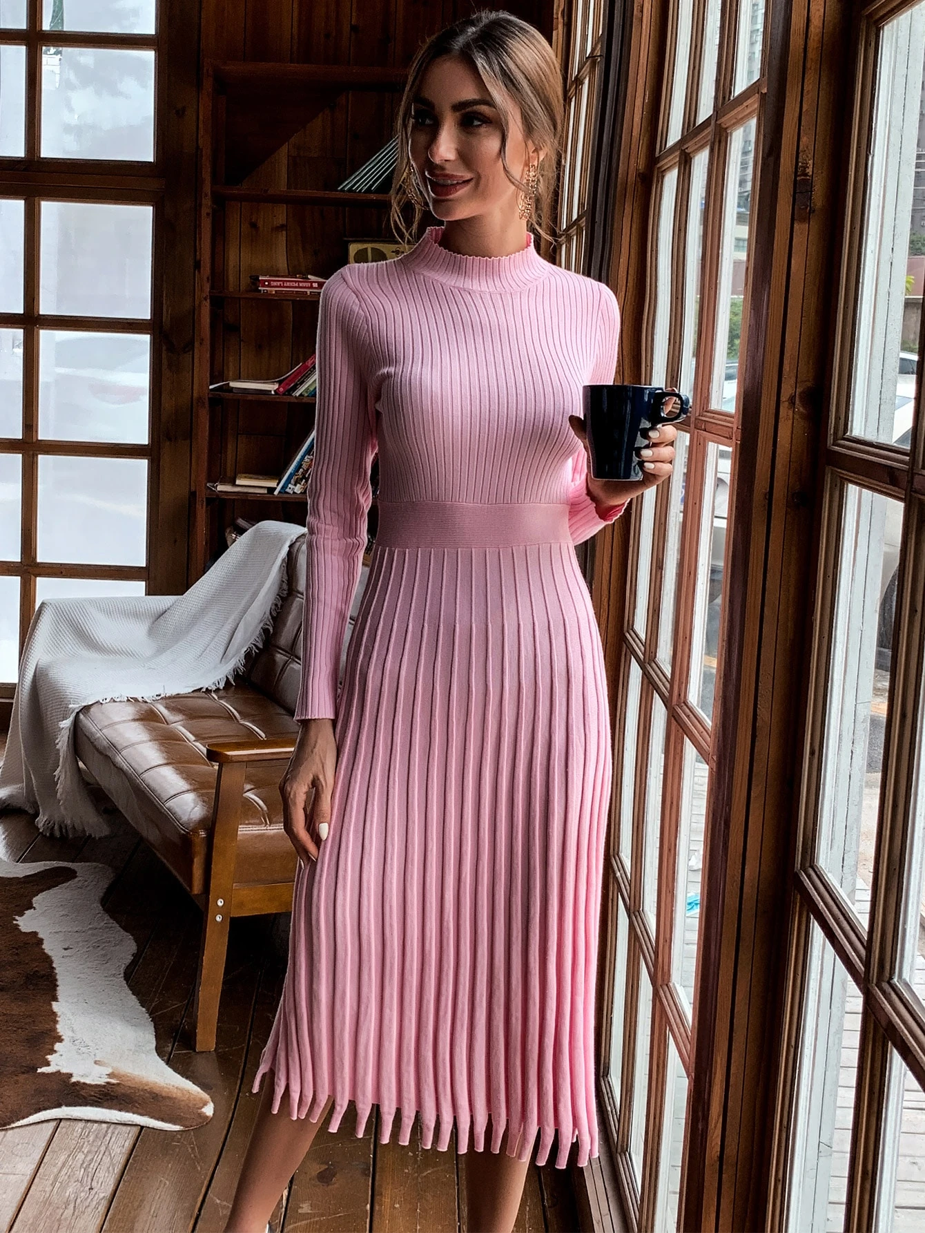 - Fringe hem rib knit sweater dress