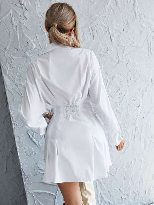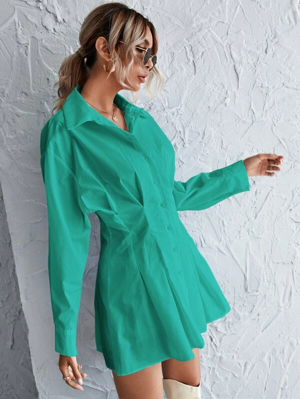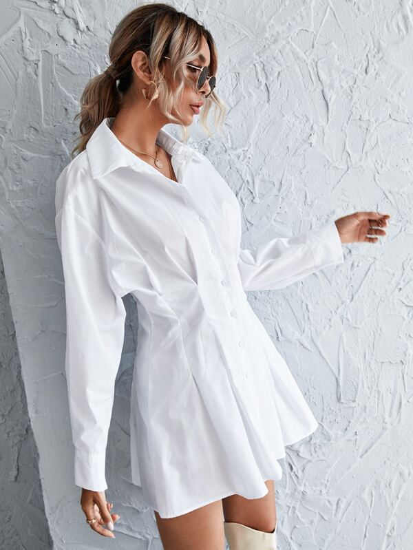 - Shopping Button front shirred back shirt dress