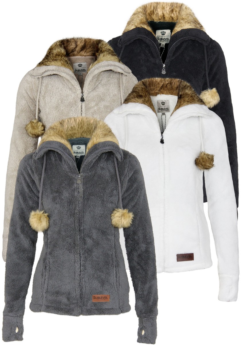 Fleecejacke mit fell Outlet, Sublevel Damen Teddy Fleecejacke mit Fell Kragen und Bommeln Outlet