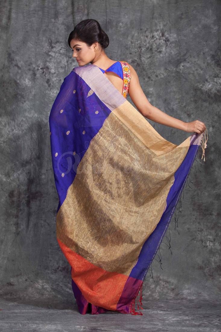 Indigo blue cotton saree Outlet, Indigo Blue Linen Cotton Saree With Zari Motifs Outlet