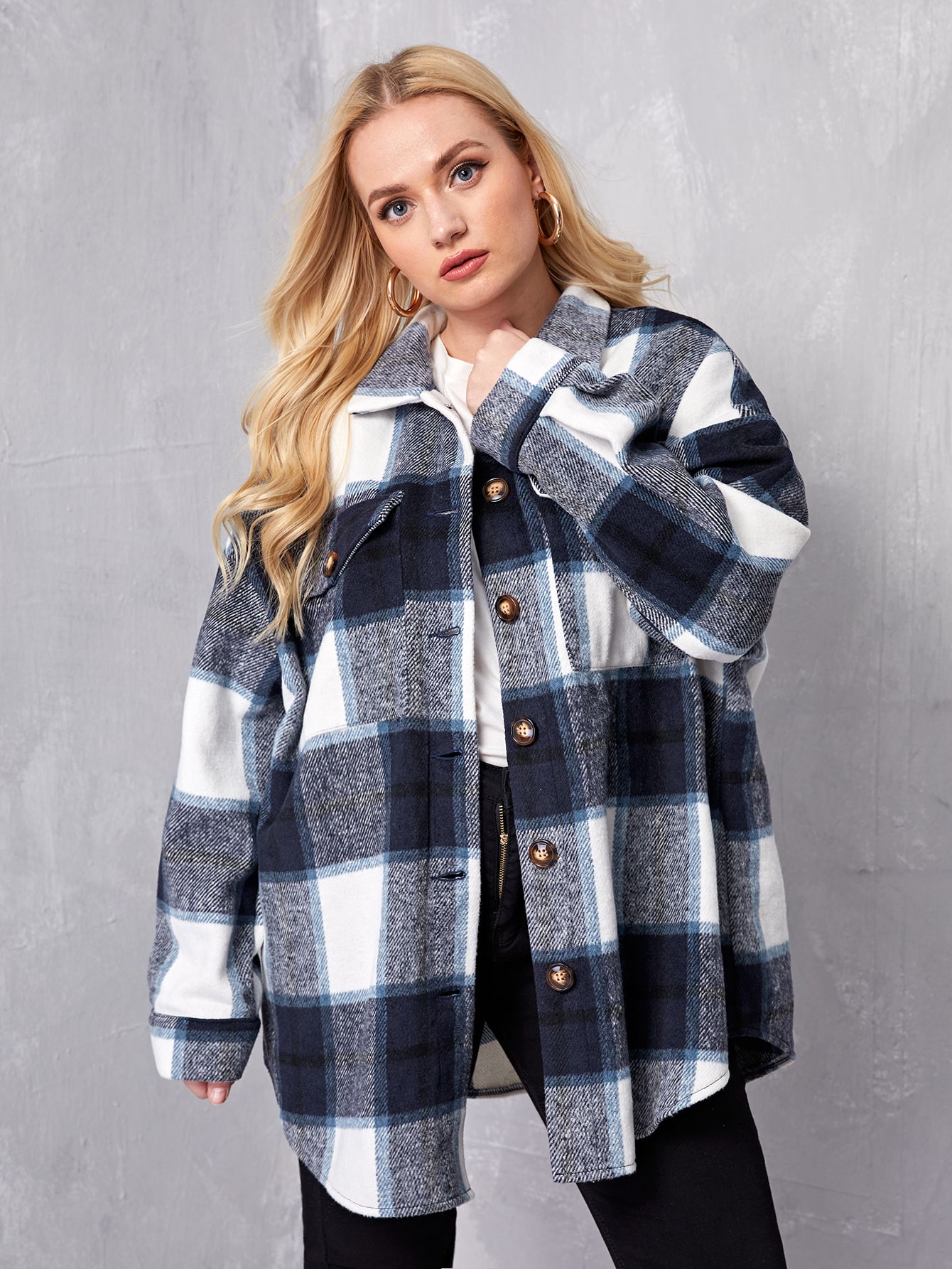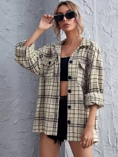 Flap pocket front drop shoulder plaid coat Outlet, SHEIN Plus Flap Pocket Front Drop Outlet