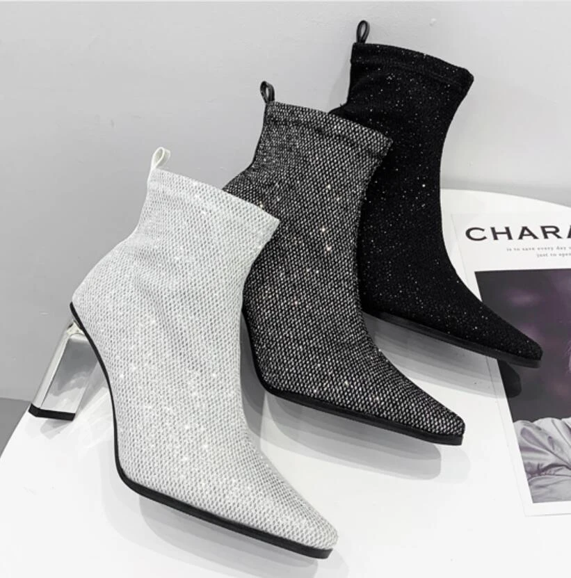 Botines brillantes mujer Outlet, Zapatos de tacón alto de aguja puntiagudos para mujer, botines con cristales de plata brillante, diamantes de imitación, brillantes, de talla grande|Botas hasta el tobillo| - AliExpress Outlet
