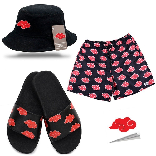 Chinelo akatsuki americanas Outlet, Chinelo Slide Short Masculino e Chapéu Bucket Anime Naruto Akatsuki Preto com Adesivo nas americanas Outlet