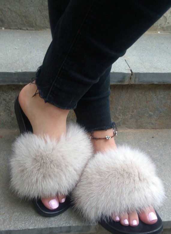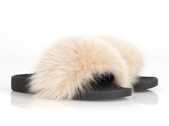Beige fur slides Outlet, Beige Big Fox Fur Slides from classy Outlet