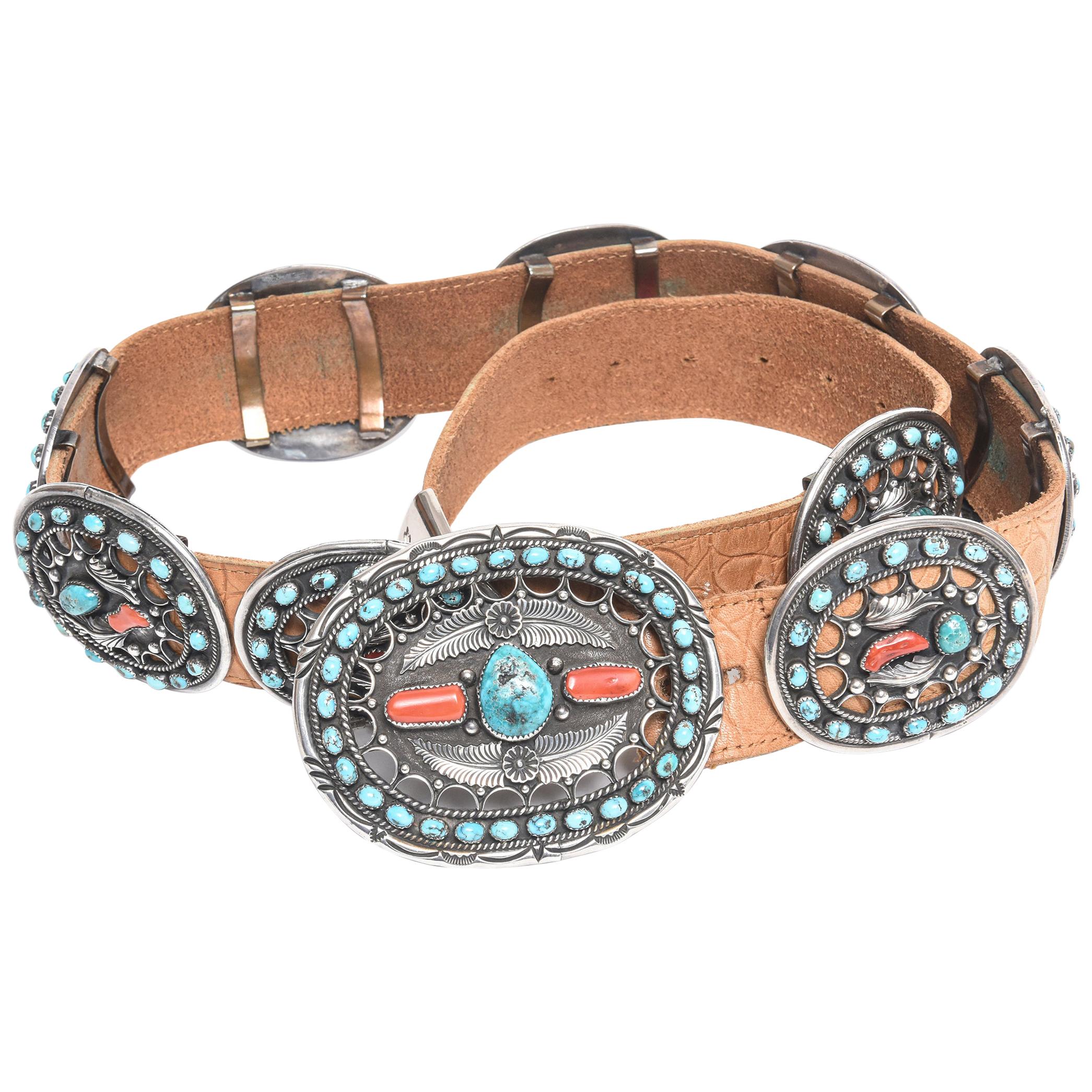 Brown leather concho belt Outlet, Al Joe Navajo Native American Coral Outlet