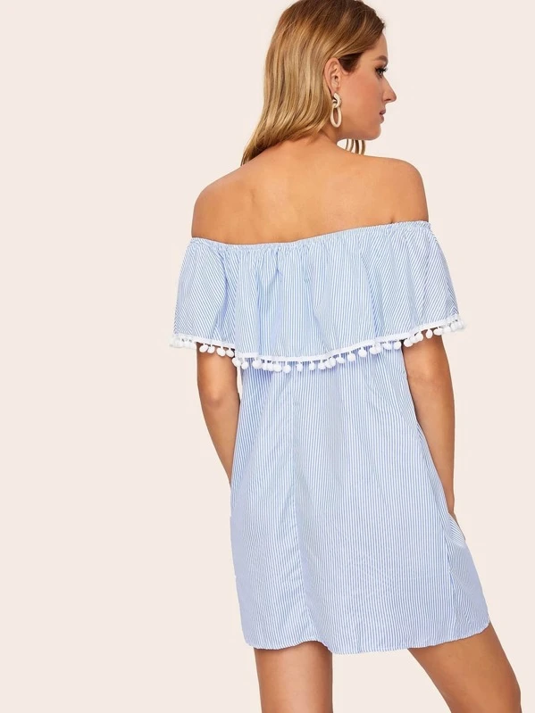 Shein pom pom dress Outlet, Off Shoulder Striped Pom Pom Dress Outlet