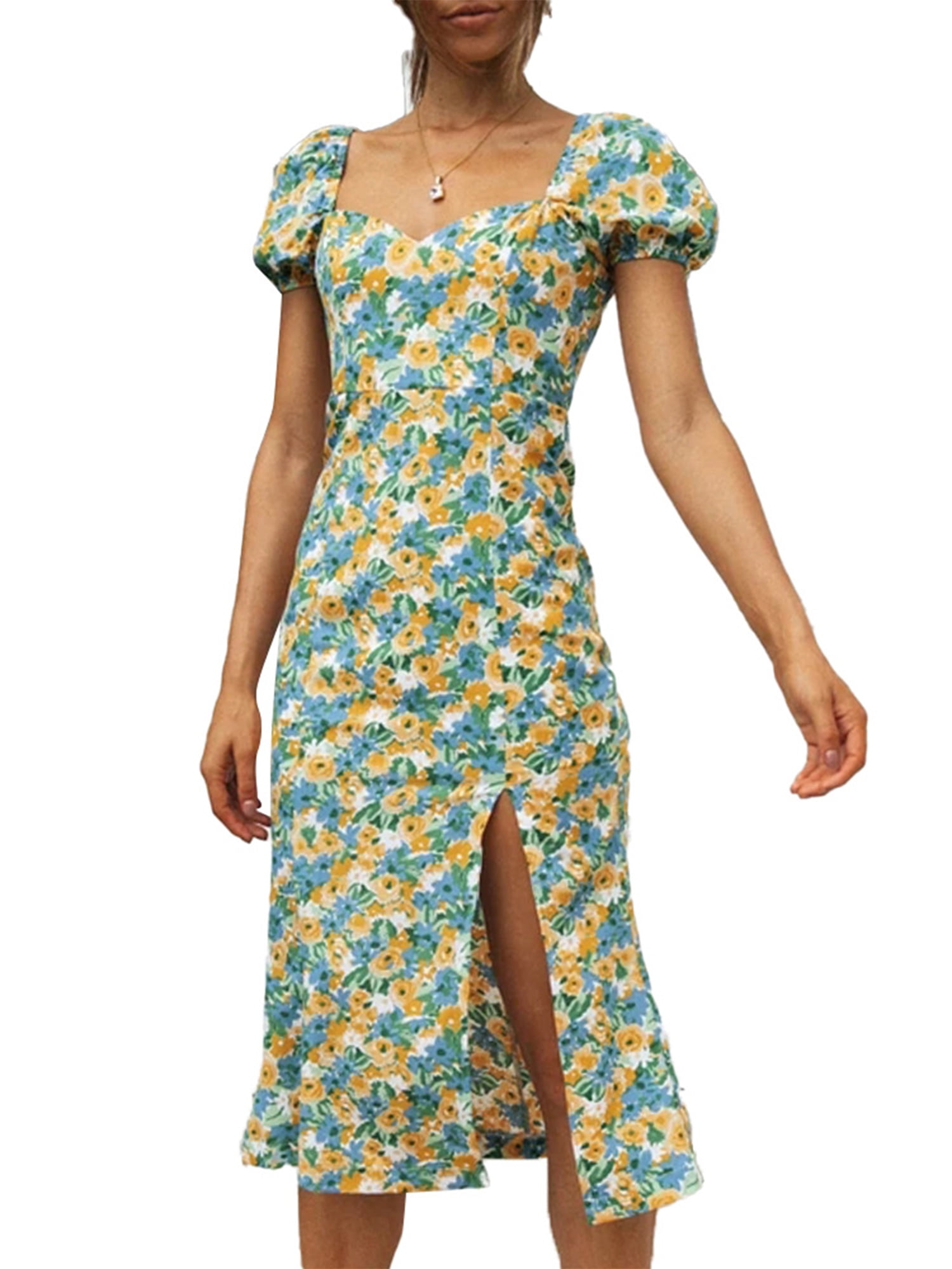 Floral slit midi dress Outlet, Floral Puff Sleeve Slit Front Midi Outlet